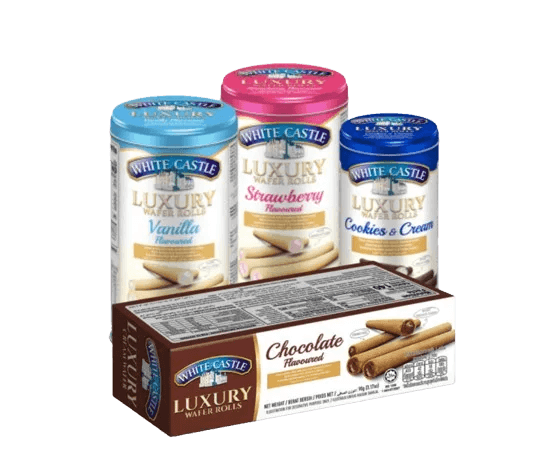 - White Castle Luxury Cream Wafers – Available in flavors like chocolate, hazelnut, vanilla, strawberry, and cookies & cream.