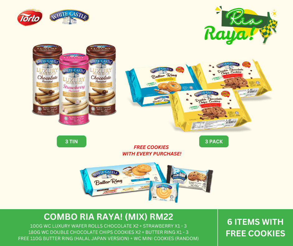 Our special Raya promo bundles start at just RM19.90, offering unbeatable value for premium, halal-certified treats. Plus, each bundle includes FREE bonus gifts, such as mini cookies and Japan-version Butter Rings, available while stocks last.